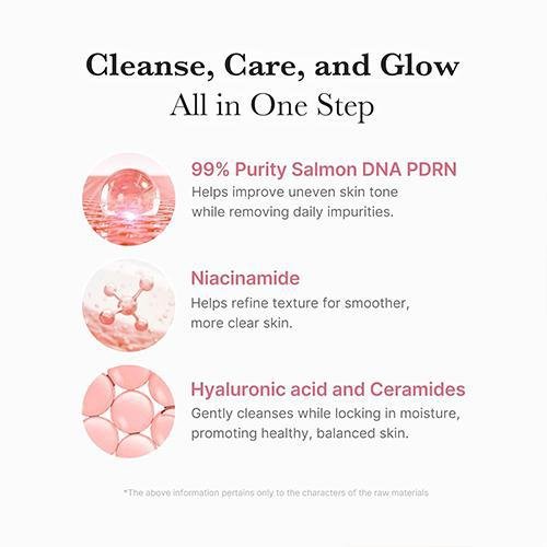 - 99% purity Salmon DNA PDRN helps improve uneven tone while removing daily impurities, Niacinamide helps refine texture for smoother, clearer skin, and Hyaluronic Acid and Ceramides gently cleanse while locking in moisture, promoting healthy, balanced skin.