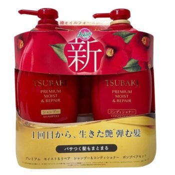 Give your hair the ultimate care with the Shiseido Tsubaki Premium Moist Shampoo & Conditioner Set. This set in practical pump bottles (450 ml each) provides intensive moisturising and repair of dry and damaged hair.