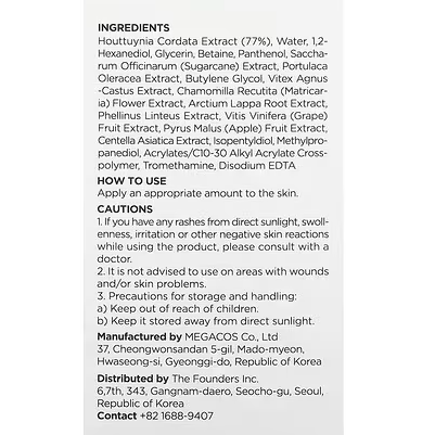 Houttuynia cordata extract (77%), water, 1,2-hexanediol, glycerin, betaine, panthenol, saccharum officinarum (sugarcane) extract, portulaca oleracea extract, butylene glycol, vitex agnus castus extract, chamomilla recutita (matricaria) flower extract, arctium lappa root extract, phellinus linteus extract, vitis vinifera (grape) fruit extract, pyrus malus (apple) fruit extract, centella asiatica extract, isopentyldiol, methylpropanediol, acrylates/C10-30 alkyl acrylate crosspolymer, tromethamine, disodium EDTA.