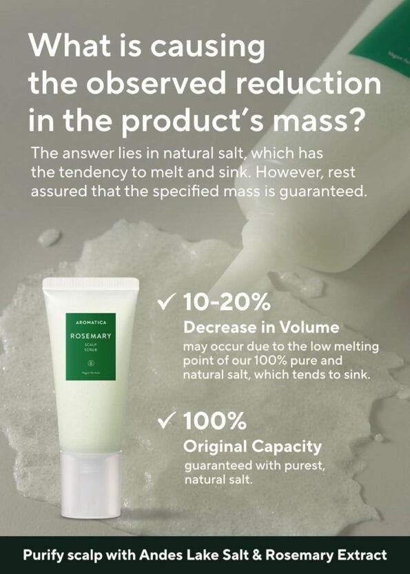 - ANDES LAKE SALT & ROSEMARY OIL: This hair scrub made by Andes lake salt and pure rosemary essential oil, offering a therapeutic approach to scalp treatment for dandruff care.
