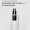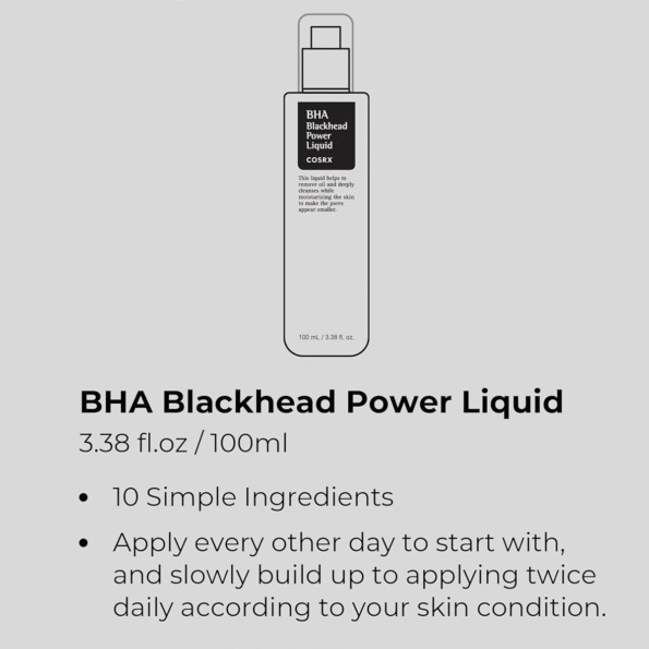 The COSRX BHA Blackhead Power Liquid is a gentle yet effective exfoliant that contains a 4% natural BHA component of betaine salicylate, which not only gets rid of blackheads and sebum inside the pores but also prevents sebum from turning into blackheads via oxidation and helps skin rebuild its moisture barrier.