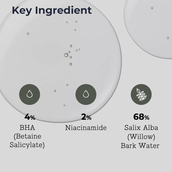 Betaine Salicylate (BHA): Deeply penetrates pores to dissolve oil & dead skin buildup