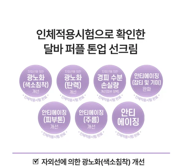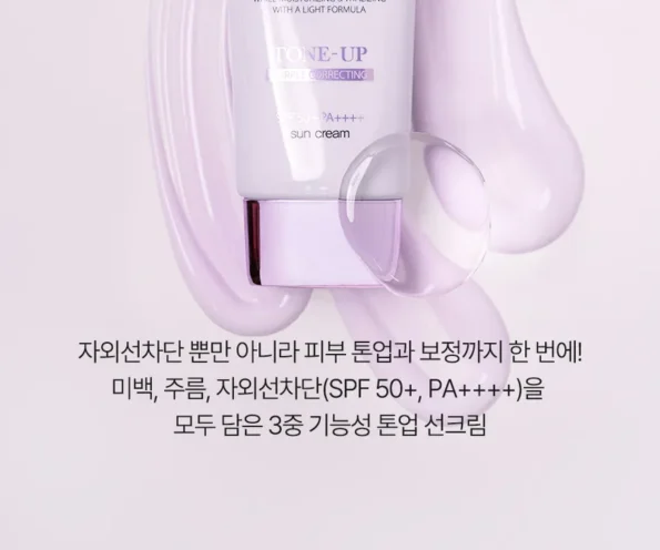 Purple tone up suncare provides clear and brightly glowing skin. Tone up sunscreen to correct skin tone into cool purple. Triple functional cosmetic for skin brightening, wrinkle improvement, and UV protection. Received vegan certification by an Italian institute with strict standards. Completed low irritation test, received reef-safe certification, and made with forest-friendly FSC package. The purple glowing sunscreen provide bright tone up effect to correct skin tone into cool undertone. The complementary color effect corrects yellow skin of Asians by mixing purple shade to remove yellowness and provide cool undertone skin. Light and refreshing tone up susncreen with rich moisturizing essence. The watery texture gently absorbs for light and refreshing tone up. Provides bright skin on any skin tones including dark, red, and yellow skin. Triple functional tone up sunscreen complete with SPF50+ PA++++ formula for skin brightening and anti-wrinkle effects.