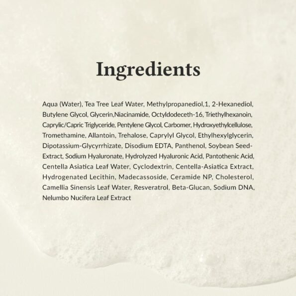 Water(Aqua), Melaleuca Alternifolia (Tea Tree) Leaf Water, Methylpropanediol, 1,2-Hexanediol, Butylene Glycol, Glycerin, Niacinamide, Octyldodeceth-16, Triethylhexanoin, Caprylic/Capric Tri-glyceride, Pentylene Glycol, Carbomer, Hydroxyethylcellulose, Tromethamine, Allantoin, Trehalose, Caprylyl Glycol, Ethylhexylglycer-in, Dipotassium Glycyrrhizate, Disodium EDTA, Panthenol, Glycine Soja (Soybean) Seed Extract, Sodium Hyaluronate, Hydrolyzed Hyaluronic Acid, Pantothenic Acid, Centella Asiatica Leaf Water, Cyclodextrin, Cen-tella Asiatica Extract, Hydrogenated Lecithin, Madecassoside, Ceramide NP, Cholesterol, Camellia Sinensis Leaf Water, Reveratrol, Beta-Glucan, Sodium DNA, Nelumbo Nucifera Leaf Extract