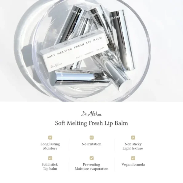 The Dr.Althea Soft Melting Fresh Lip Balm is a deeply moisturizing lip treatment that melts gently upon contact, delivering instant nourishment and a natural, healthy glow. Enriched with Shea Butter, Plant-Derived Oils, and Vitamin E, this lip balm repairs dryness and forms a protective moisture barrier to keep lips smooth, plump, and hydrated all day long.