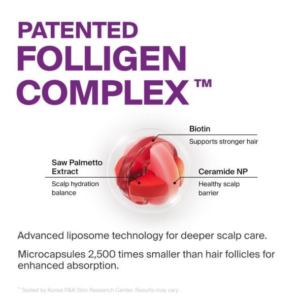 - Folligen Complex for Scalp Care: Our patented Folligen Complex supports scalp strength and elasticity while promoting thicker, fuller-looking hair. With particles 25,000 times smaller than pores, active ingredient absorption is maximized.