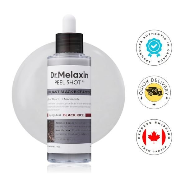 Dr.Melaxin Peel Shot Exfoliant Black Rice Ampoule 80ml is a highly effective skincare solution designed for complete pore care and radiant skin. This unique ampoule is clinically proven to reduce blackheads, control excess sebum, and minimize enlarged pores, leaving your skin smoother and more refined. Formulated with Black Rice Extract and Rice Bran Water, it gently exfoliates impurities while delivering powerful pore-tightening ingredients deep into the skin.