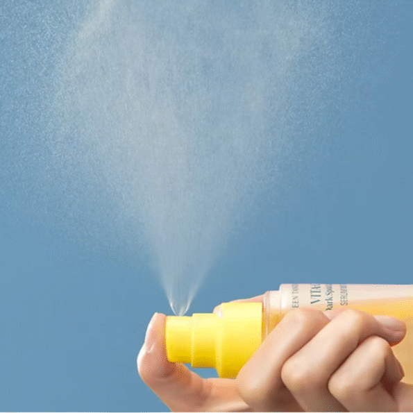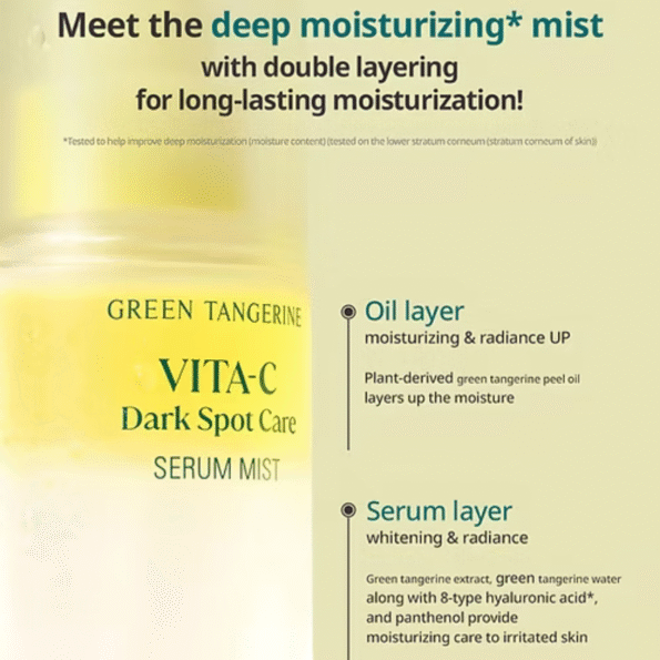 - This vegan serum mist, infused with green tangerine extract, helps reduce the appearance of dark spots and freckles while revitalizing the skin for a firmer, more radiant complexion.