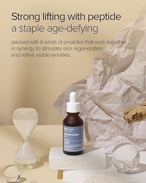 - A serum packed with 6 kinds of peptides that work together in synergy to stimulate skin regeneration and refine visible wrinkles, preventing advanced signs of aging.