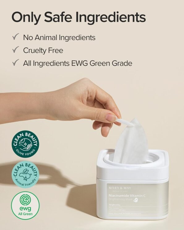 With its convenient large-capacity case, you can easily pull out one sheet each day, minimizing unnecessary waste. Rest assured that all ingredients in this mask meet the EWG green grade standards, except fragrance. What’s more, Mary&May is proud to be against animal testing and has thoughtfully designed eco-friendly packaging.