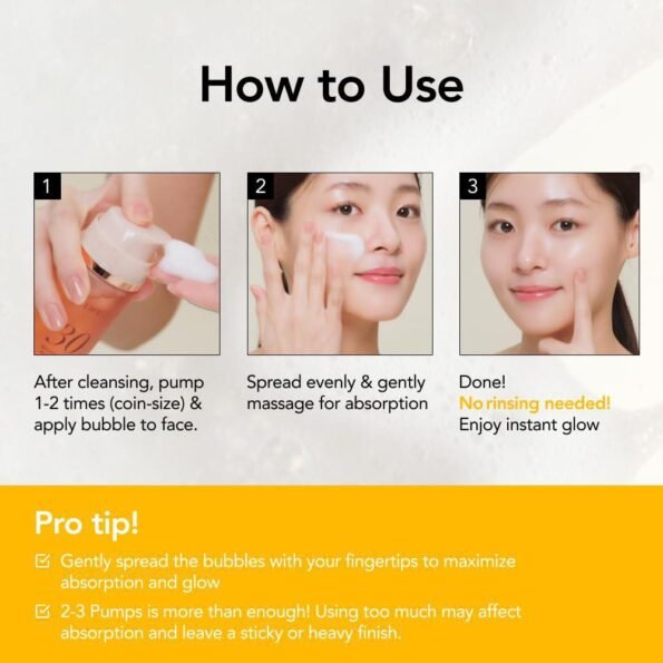 Apply on clean skin. Wait 30 seconds as bubbles form, gently massage, then rinse with lukewarm water. Follow with toner and moisturizer.