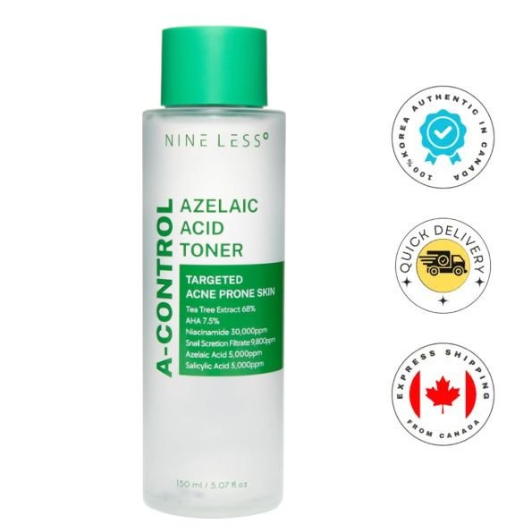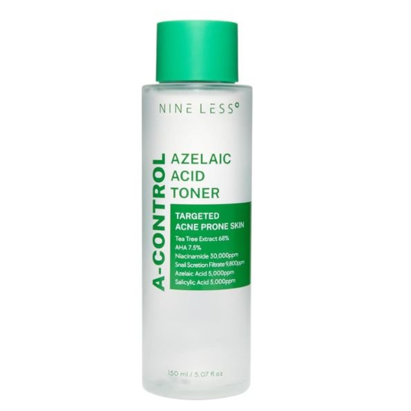 Dive into the rejuvenating power of our Azelaic Acid Toner, enriched with AHAs like Glycolic and Lactic Acid. This potent formula gently exfoliates, removing dead skin cells to unveil a more radiant, smoother complexion. Unveil your skin’s natural radiance with our Azelaic Acid Toner, a multi-tasking marvel that targets a myriad of skin concerns. I this toner gently exfoliates dead skin cells, revealing a brighter. NINE LESS A-Control Azelaic Acid Toner refines texture, reduces blemishes, and hydrates. With Tea Tree Extract, Niacinamide, Azelaic Acid, and Snail Filtrate, it brightens, soothes, and smooths skin.