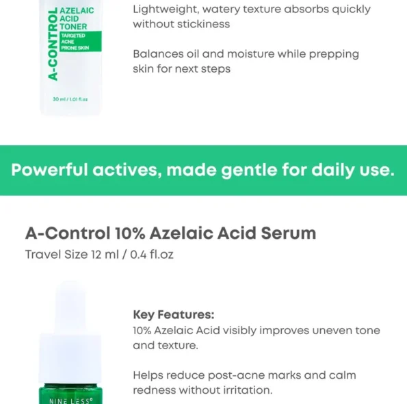 Discover the ultimate solution for acne-prone and oily skin with the Nineless A-Control Mini Kit (4 Pcs) — a complete Korean skincare set designed to balance oil, calm irritation, and restore your skin’s natural clarity. This compact kit includes four essential steps that work together to cleanse, tone, treat, and hydrate for visibly smoother, clearer skin.