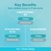 - KEY INGREDIENTS: Formulated with Pantothenic Acid, a well-known supplement for reducing acne and inflammation by controlling excess oil that can lead to clogged pores. It also includes 4 types of hyaluronic acid, which work together to soothe and hydrate sensitive, dry skin. Niacinamide effectively reduces post-acne marks, while panthenol helps restore the skin’s natural barrier and overall skin health.