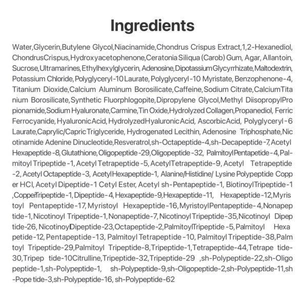 - Packed with Fish Collagen, NAD+ and 50 Peptides to rejuveate mature and dull skin.
