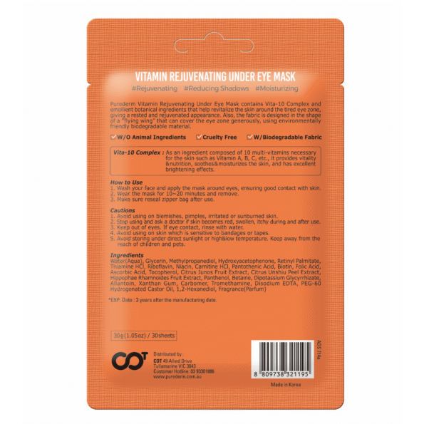 Purederm Vitamin Rejuvenating Under Eye Mask contains Vita-10 Complex and emollient botanical ingredients that help revitalise the skin around the tired eye zone, giving a rested and rejuvenated appearance.
