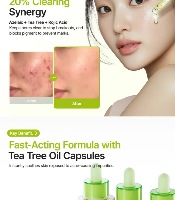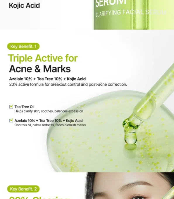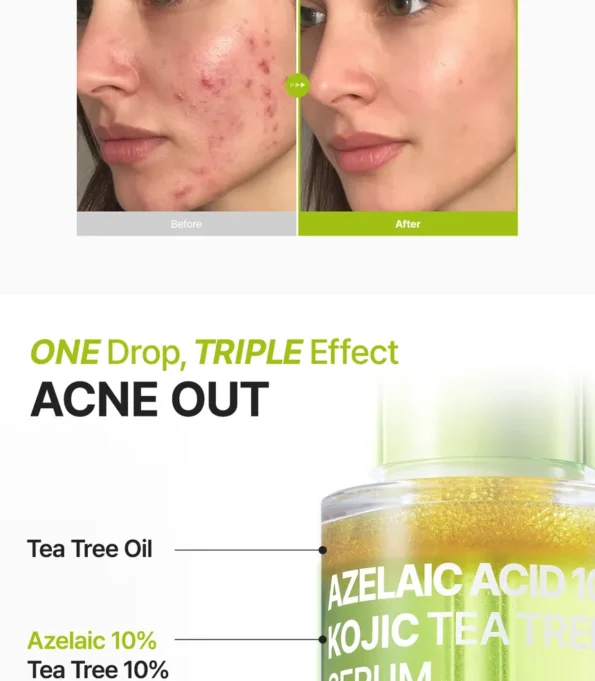 - TRIPLE ACTIVE FOR ACNE & MARKS — 20% FORMULA Azelaic 10% + Tea Tree 10% + Kojic Acid deliver a powerful triple-action approach for breakout control and visible post-acne correction.