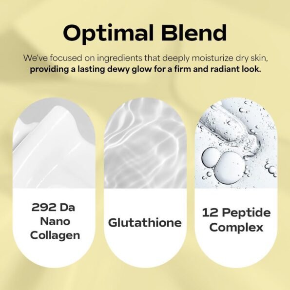 - 706,696 ppm of real collagen maximize deeply moisturize dry skin, providing a lasting dewy glow for a firm and radiant look with the 292 Da Nano Collagen, Glutathione, and 12 Peptide Complex.