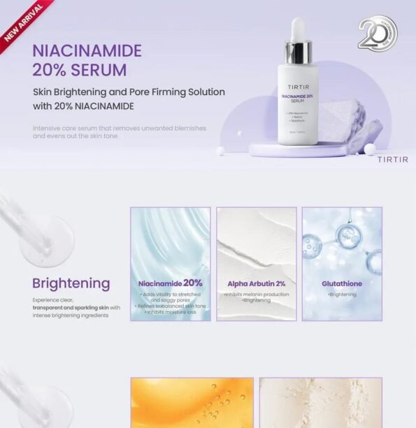 Reveal crystal-clear, radiant skin with the TIRTIR Niacinamide 20% Serum, a high-performance brightening and anti-aging treatment that targets blemishes, dark spots, and uneven skin tone.