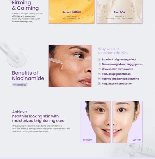 - Niacinamde 20%, Alpha Arbutin 2%, and Glutathione offer transparent and sparkling skin, while Retinol 500IU and Zinc PCA create younger-looking skin with effective anti-aging care and calm-only irritation on skin with intense soothing care.