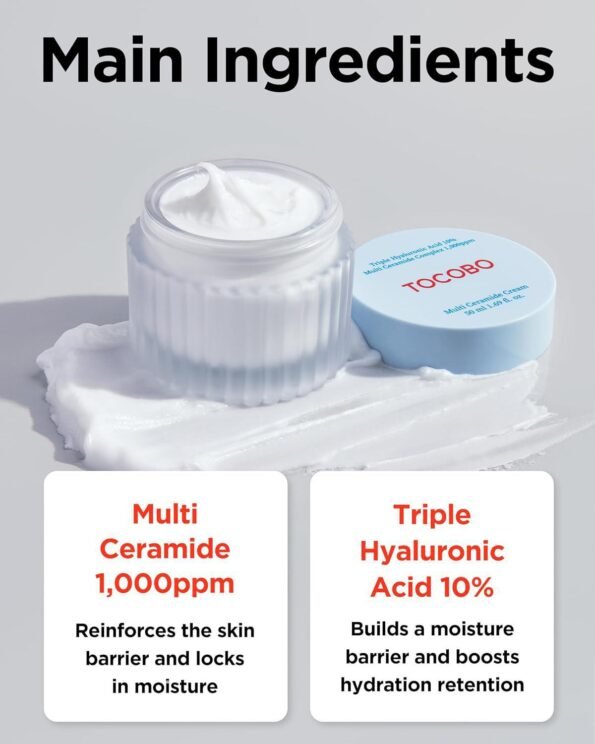 TOCOBO Multi Ceramide Cream is a fast-absorbing daily moisturizer designed to lock in hydration and support a healthy skin barrier. Formulated with a blend of 5 Multi-Ceramides (10,000ppm) and Panthenol, this cream restores moisture balance, soothes irritation, and helps strengthen weakened or sensitive skin over time.