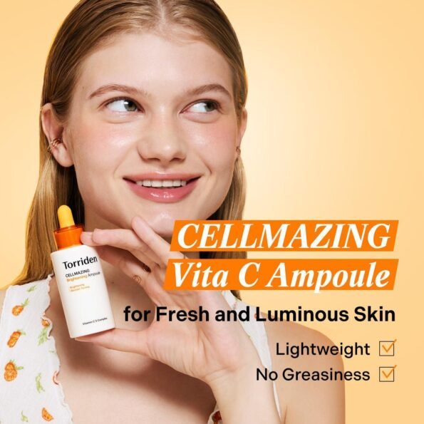 Torriden Cellmazing VITA C Brightening Ampoule 30ml is a powerful brightening serum designed to revive dull skin, improve radiance, and even out skin tone. Formulated with a stable and gentle form of Vitamin C, this ampoule boosts clarity while minimizing dark spots, pigmentation, and early signs of aging.
