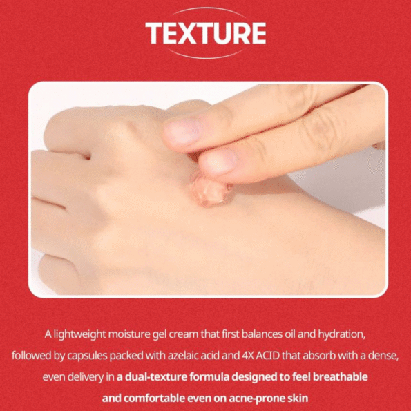 - A lightweight moisture gel cream that balances oil and hydration, featuring capsules of azelaic acid and 4X ACID that absorb evenly in a breathable dual-texture formula, perfect for acne-prone skin.