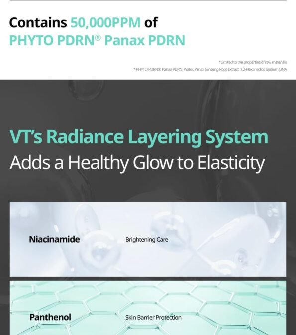 VT’s PDRN Toner is formulated with 50,000ppm of low-molecular ginseng-derived PHYTO PDRN® Panax PDRN to unlock skin radiance and elasticity. The formula is also enriched with niacinamide, panthenol, allantoin and centella extract for extra brightening and soothing care. This lightweight and unscented toner hydrates skin without causing irritation, making it suitable for all skin types including sensitive skin.