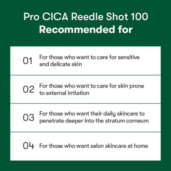- The delicate design of the micro-sized Cica Reedle facilitates skin absorption and awakens the skin condition to restore healthy skin.