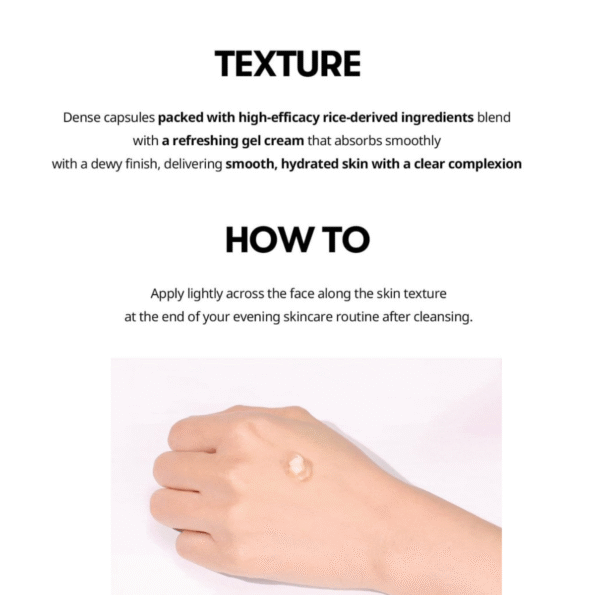 - Dense capsules packed with high-efficacy rice-derived ingredients blend with a gel cream that absorbs smoothly, delivering a dewy finish.
